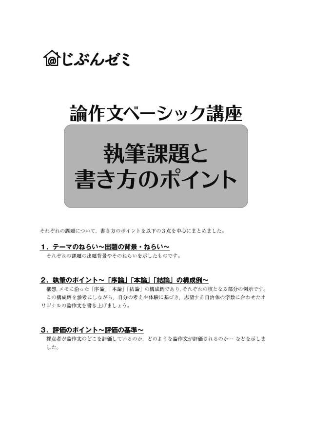 TOP通信講座 論作文講座 論作文ベーシックコース 論作文ベーシックコース 価格: ¥24,200 (税込) 販売期間: 第1志望自治体選択【選択必須】: 選択してください 北海道 札幌市 青森県 岩手県 宮城県 仙台市 秋田県 山形県 福島県 茨城県 栃木県 群馬県 埼玉県 さいたま市 千葉県・千葉市 東京都 神奈川県 横浜市 川崎市 相模原市 新潟県 新潟市 富山県 石川県 福井県 山梨県 長野県 岐阜県 静岡県 静岡市 浜松市 愛知県 名古屋市 三重県 滋賀県 京都府 京都市 大阪府 大阪市 堺市 豊能地区 兵庫県 神戸市 奈良県 和歌山県 鳥取県 島根県 岡山県 岡山市 広島県・広島市 山口県 徳島県 香川県 愛媛県 高知県 福岡県 福岡市 北九州市 佐賀県 長崎県 熊本県 熊本市 大分県 宮崎県 鹿児島県 沖縄県 第2志望自治体選択: 選択してください 北海道 札幌市 青森県 岩手県 宮城県 仙台市 秋田県 山形県 福島県 茨城県 栃木県 群馬県 埼玉県 さいたま市 千葉県・千葉市 東京都 神奈川県 横浜市 川崎市 相模原市 新潟県 新潟市 富山県 石川県 福井県 山梨県 長野県 岐阜県 静岡県 静岡市 浜松市 愛知県 名古屋市 三重県 滋賀県 京都府 京都市 大阪府 大阪市 堺市 豊能地区 兵庫県 神戸市 奈良県 和歌山県 鳥取県 島根県 岡山県 岡山市 広島県・広島市 山口県 徳島県 香川県 愛媛県 高知県 福岡県 福岡市 北九州市 佐賀県 長崎県 熊本県 熊本市 大分県 宮崎県 鹿児島県 沖縄県 第3志望自治体選択: 選択してください 北海道 札幌市 青森県 岩手県 宮城県 仙台市 秋田県 山形県 福島県 茨城県 栃木県 群馬県 埼玉県 さいたま市 千葉県・千葉市 東京都 神奈川県 横浜市 川崎市 相模原市 新潟県 新潟市 富山県 石川県 福井県 山梨県 長野県 岐阜県 静岡県 静岡市 浜松市 愛知県 名古屋市 三重県 滋賀県 京都府 京都市 大阪府 大阪市 堺市 豊能地区 兵庫県 神戸市 奈良県 和歌山県 鳥取県 島根県 岡山県 岡山市 広島県・広島市 山口県 徳島県 香川県 愛媛県 高知県 福岡県 福岡市 北九州市 佐賀県 長崎県 熊本県 熊本市 大分県 宮崎県 鹿児島県 沖縄県 数量: セット 在庫: ○ 在庫 ○ 返品についての詳細はこちら 初めて学ぶ人にも分かりやすい『手取り足取り 特訓道場 合格する論作文』で書き方を学びます。添削指導は指定の課題(6回)+自由課題(1回)の合計7回。答案到着後、約3週間で添削・返却します。 ※2026年実施試験に向けた新クールは、9月上旬より開講となります。